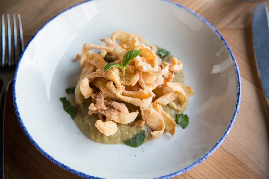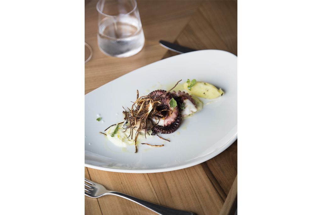 - Octopus, crunchy or “a pignata”. Two different techniques used to enhance the raw material. One modern, the other linked to tradition. On the one hand the tentacles are made crunchy and lightly smoked and then served with a cream of leeks and a quenelle of potatoes. On the other hand, a version cooked in a traditional “pignata”, a clay casserole, with tomato and potatoes.